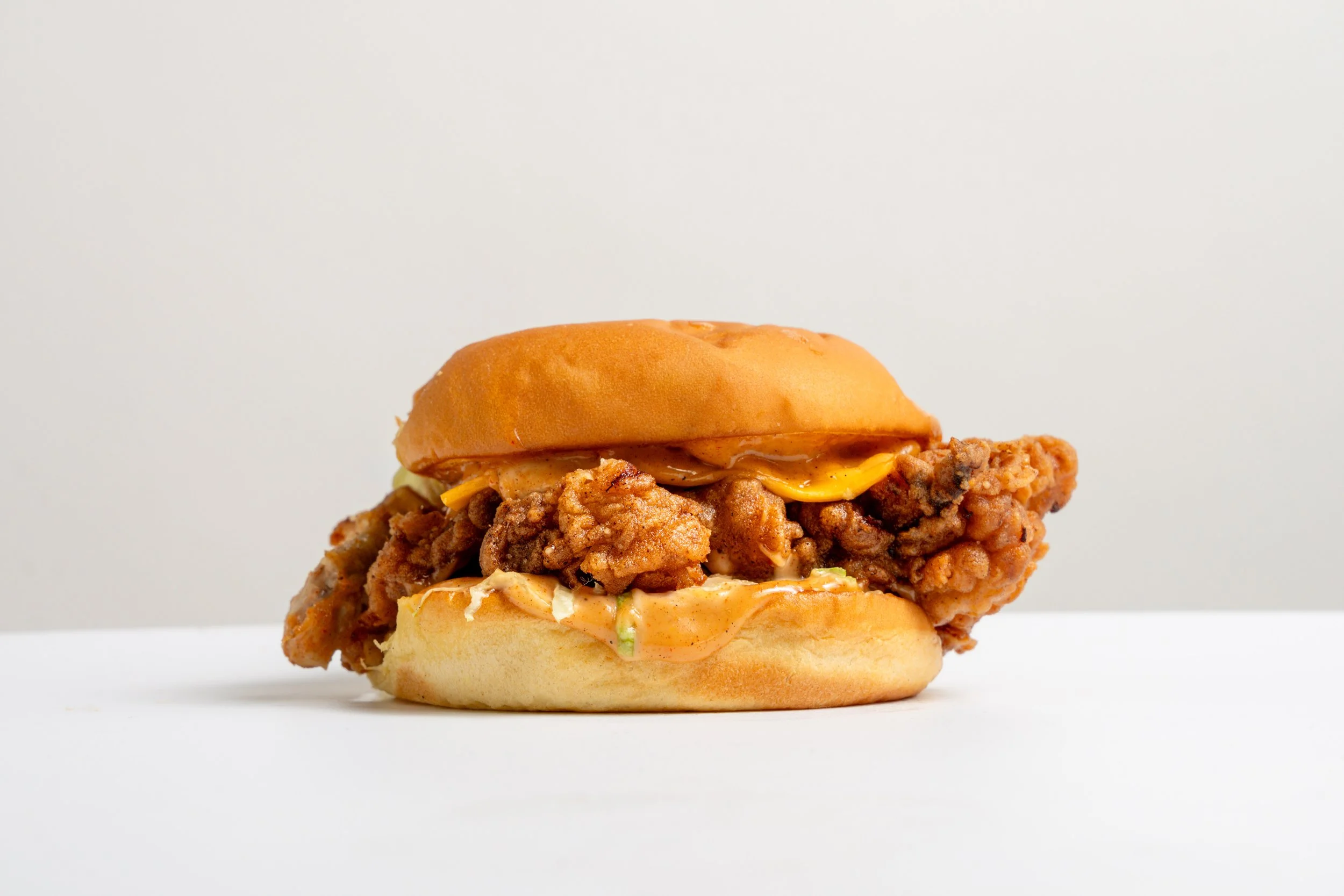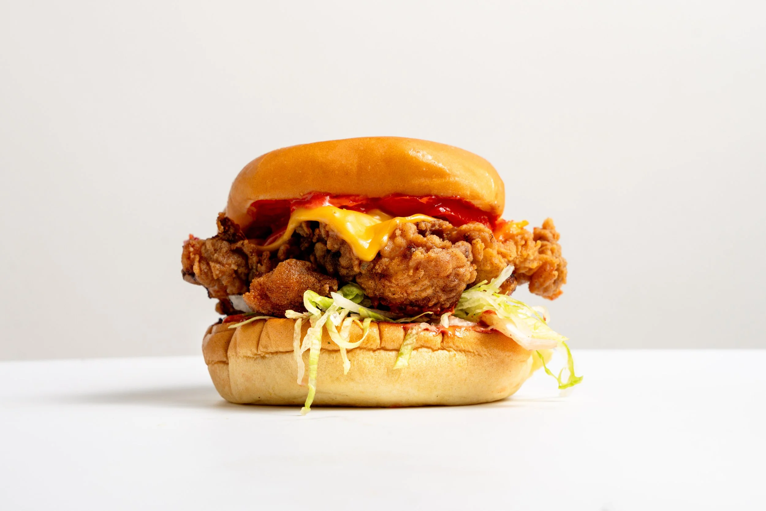 our soft potato bun with one housemade buttermilk chicken, premium cheese, piquante peppers, lettuce and signature hot sauce.