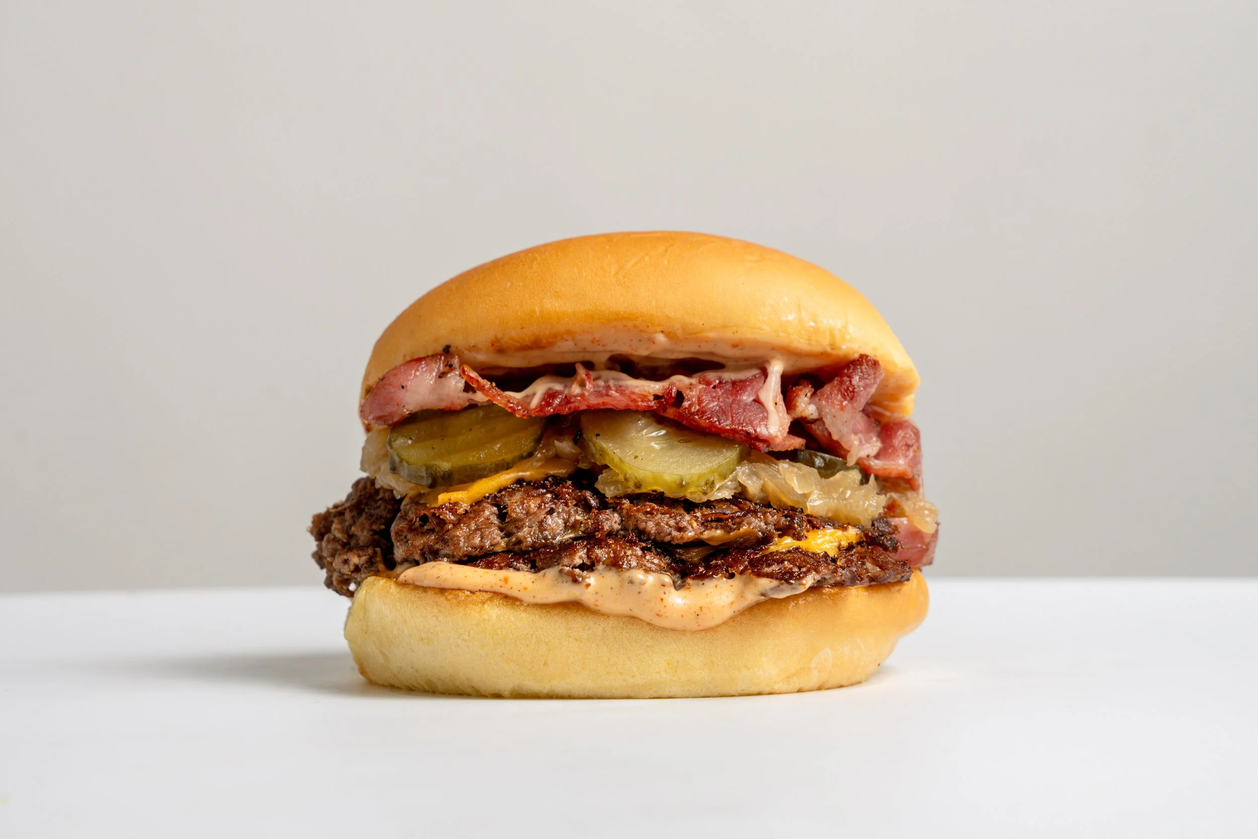 our soft potato bun with two smashed beef patties, premium cheese, caramelised onions, gherkins, beef bacon and signature house sauce.