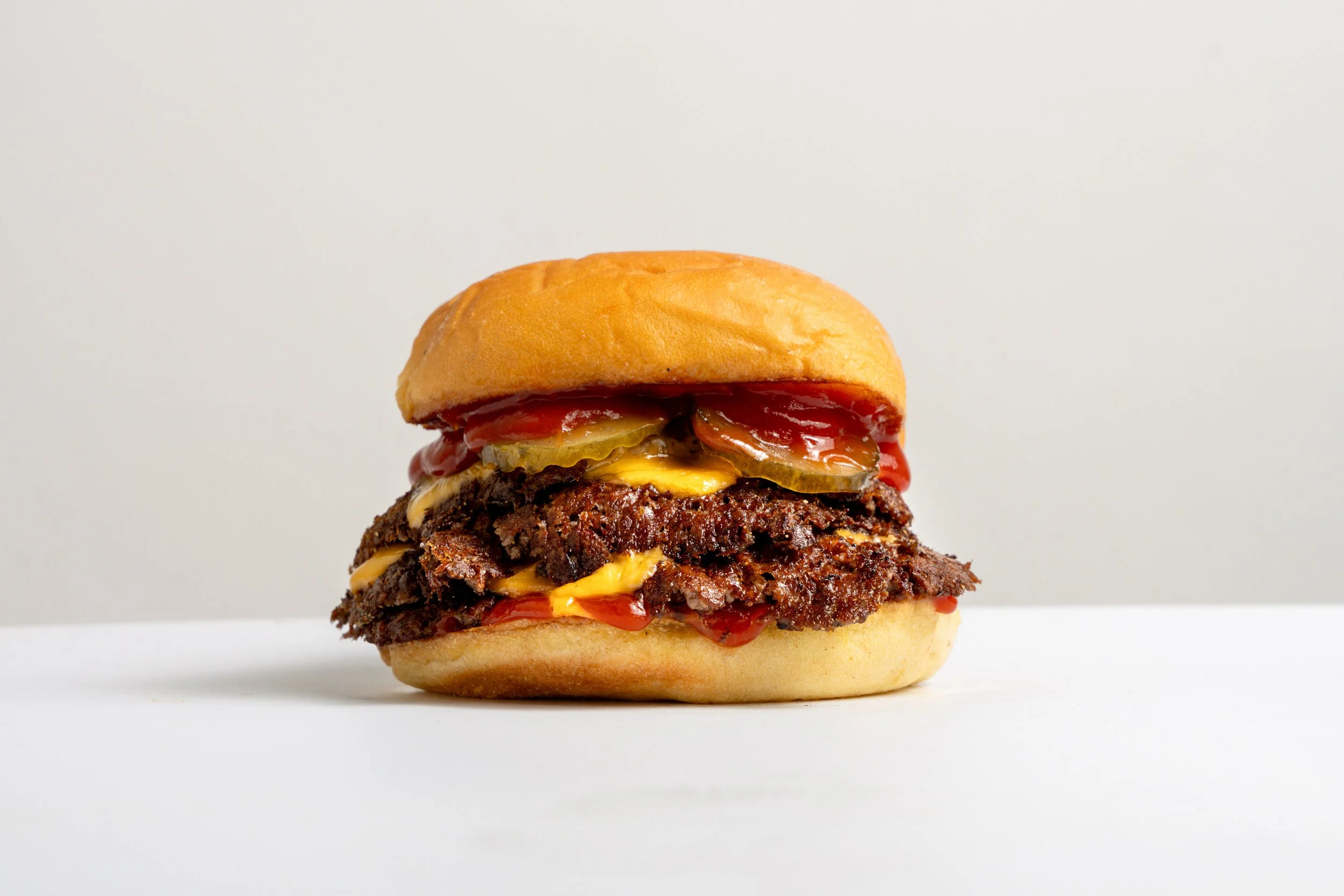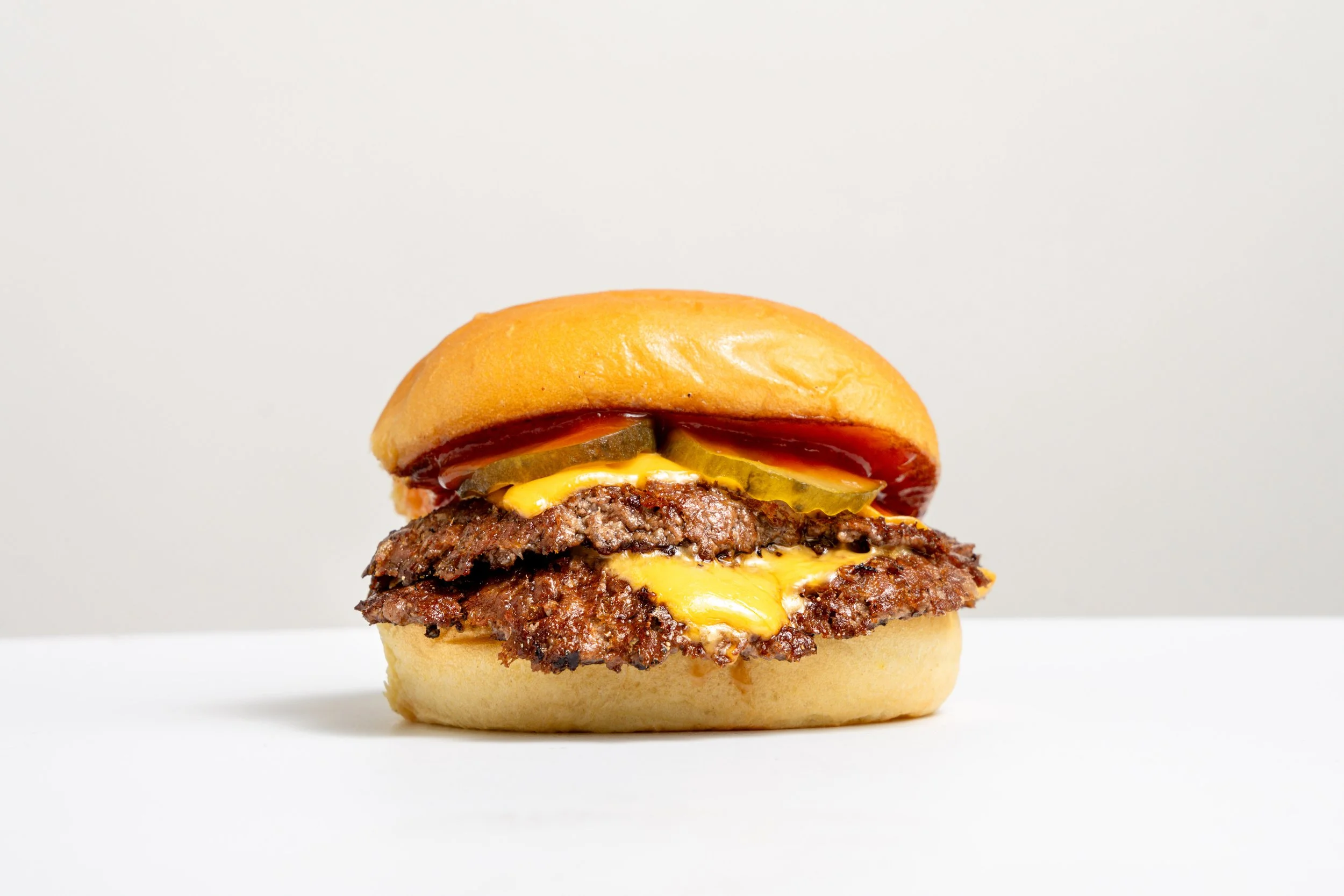 our soft potato bun with two smashed beef patties, premium cheese, gherkins and ketchup.