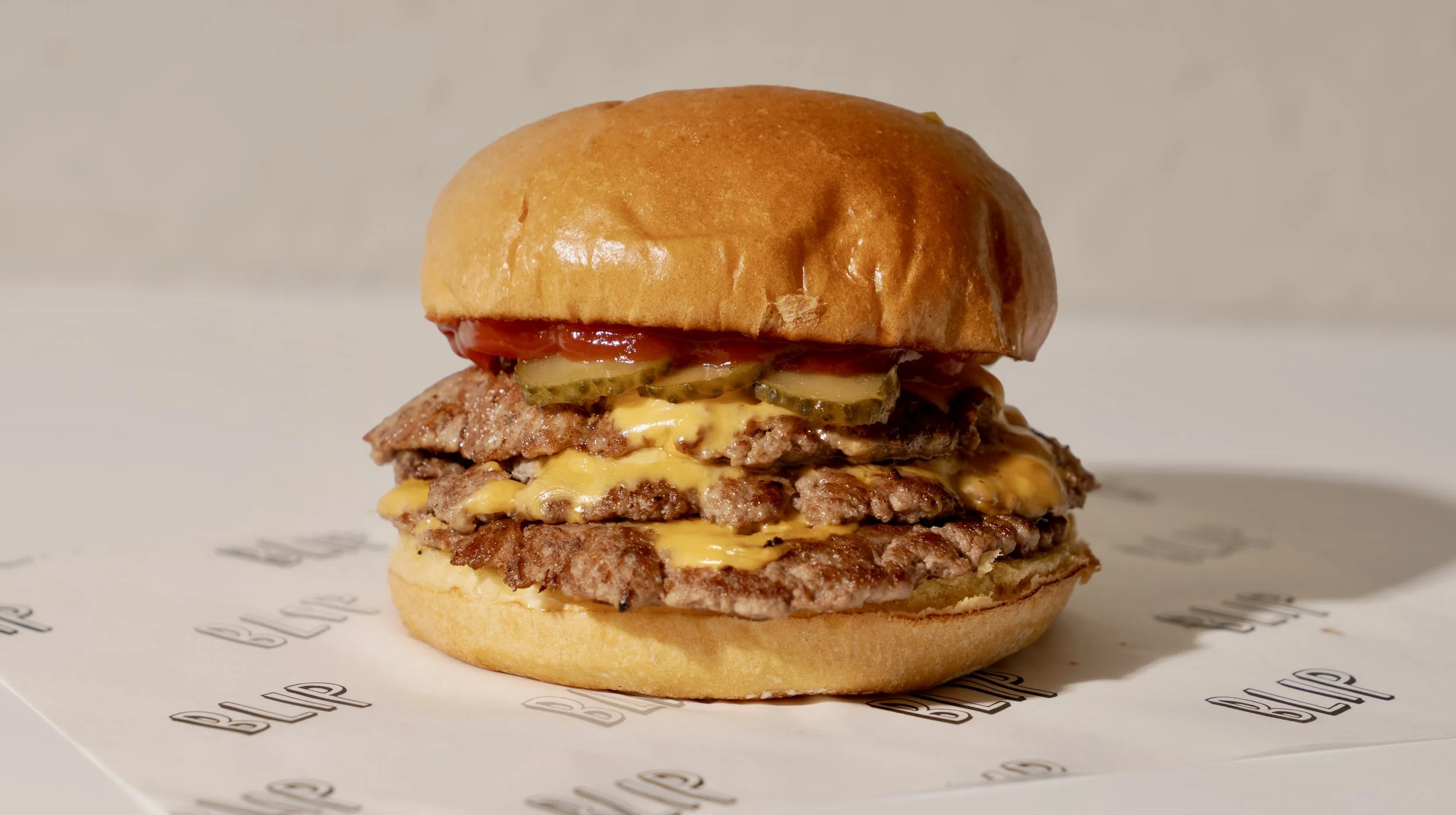 our soft potato bun with three smashed 28 day aged beef patties, premium cheese, gherkins and ketchup.