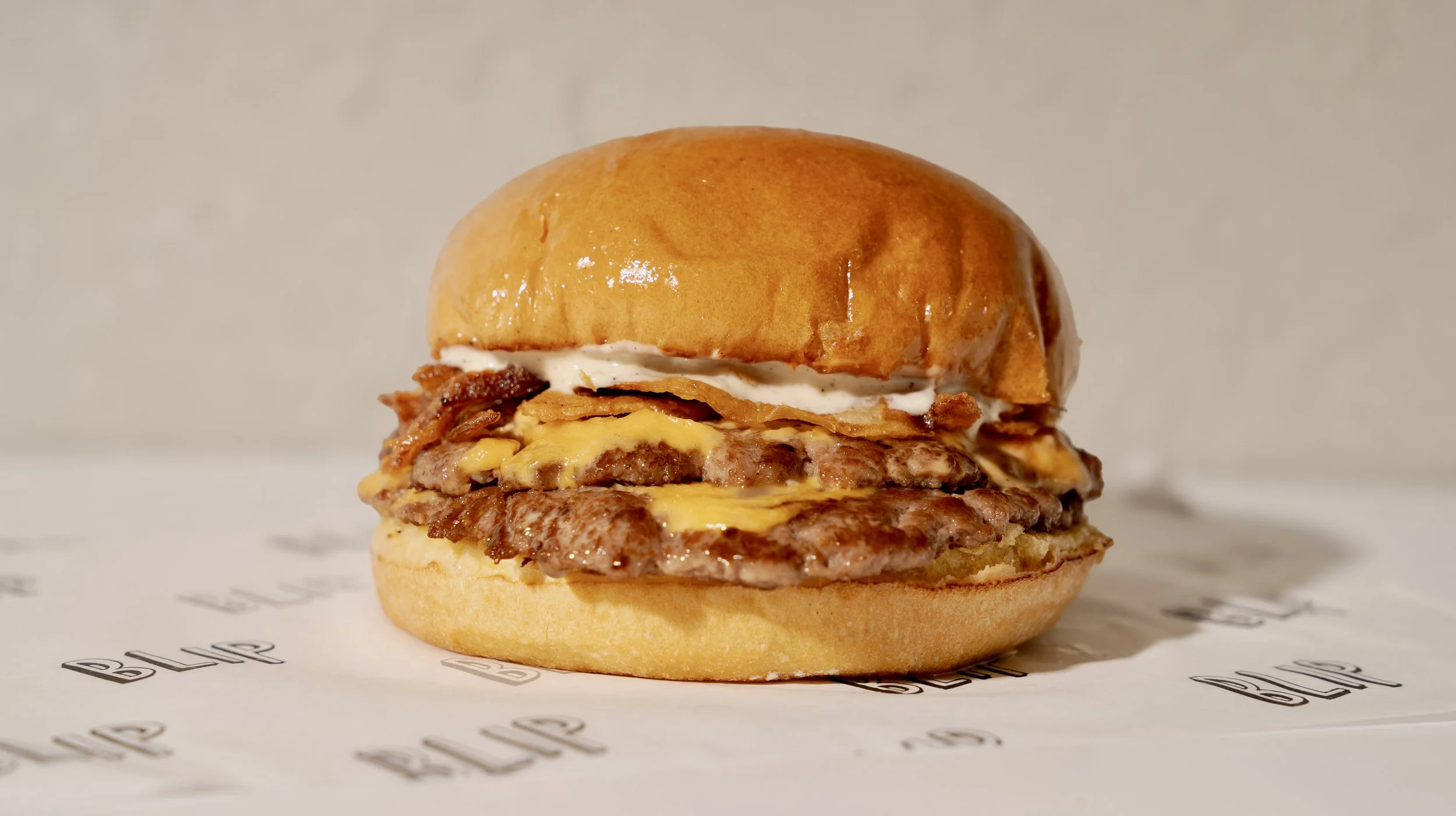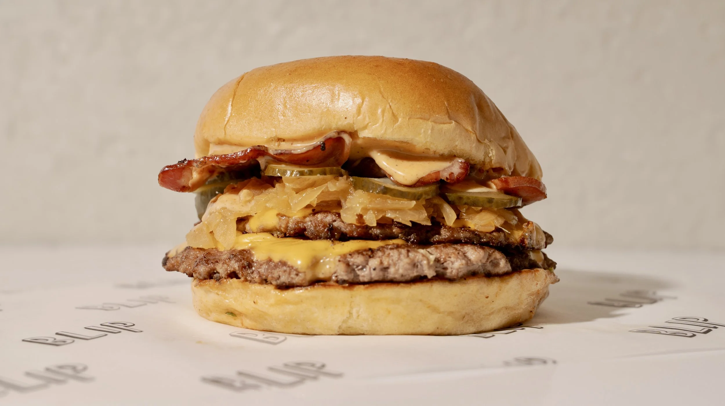our soft potato bun with two 28 day aged smashed beef patties, caramelised onions, gherkins, beef bacon and signature house sauce.
