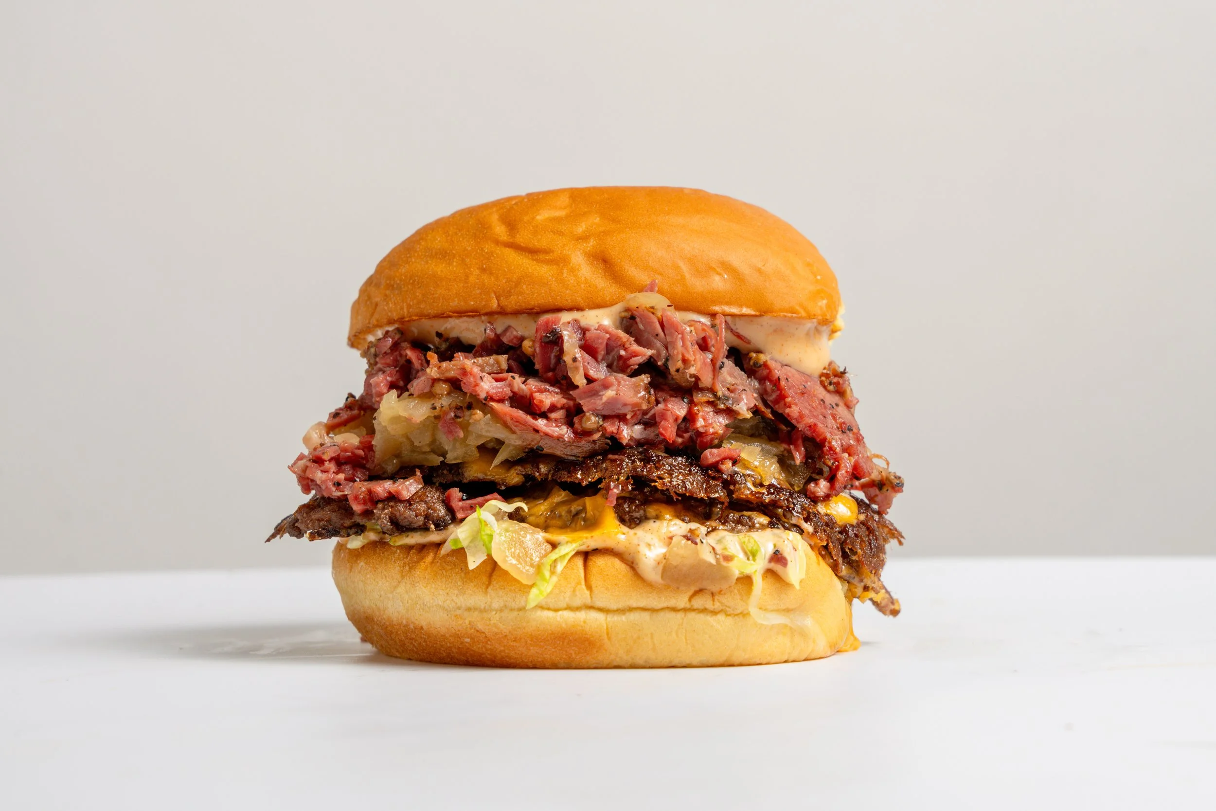 our soft potato bun with two smashed beef patties, premium cheese, caramelised onions, lettuce topped with 12 hour housemade smoked pastrami and signature house sauce.