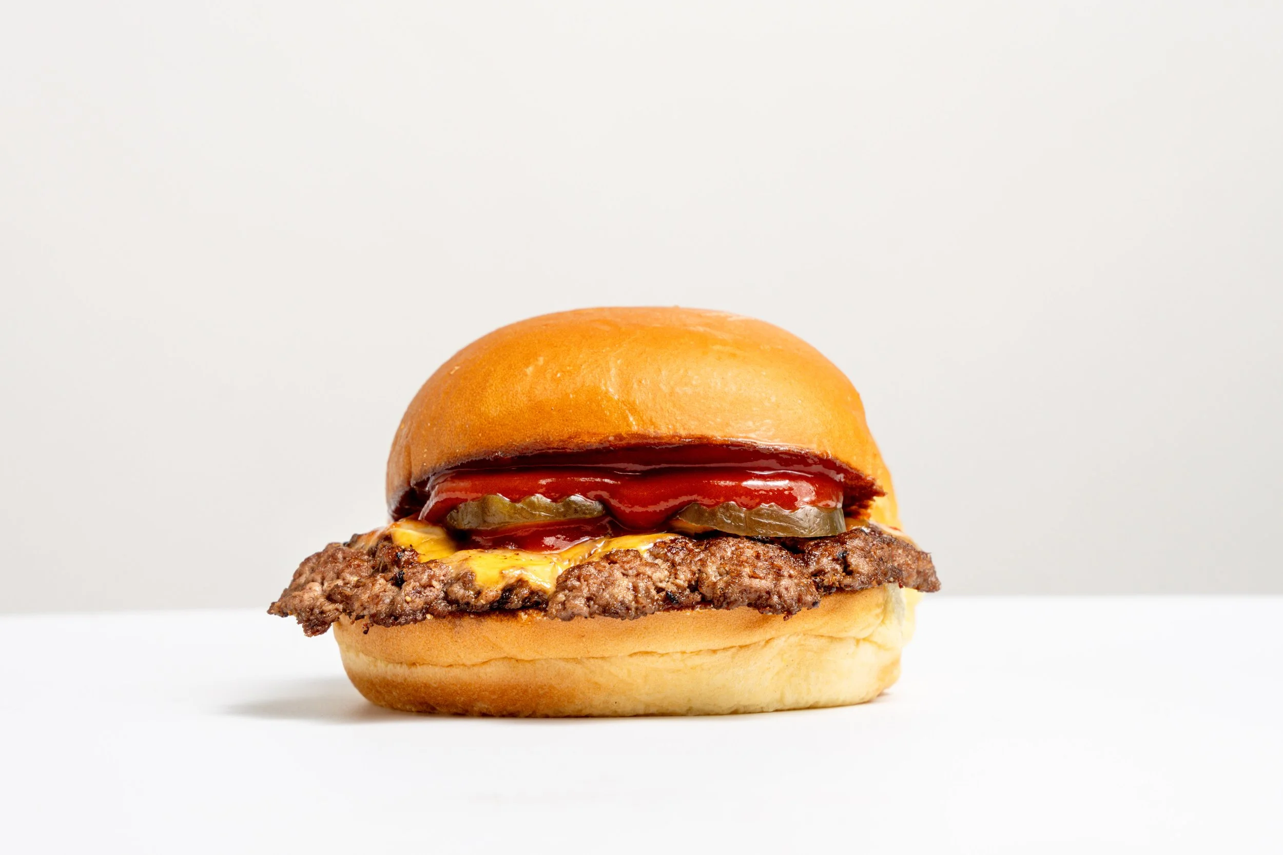 our soft potato bun with one smashed beef patty, premium cheese, gherkins and ketchup.